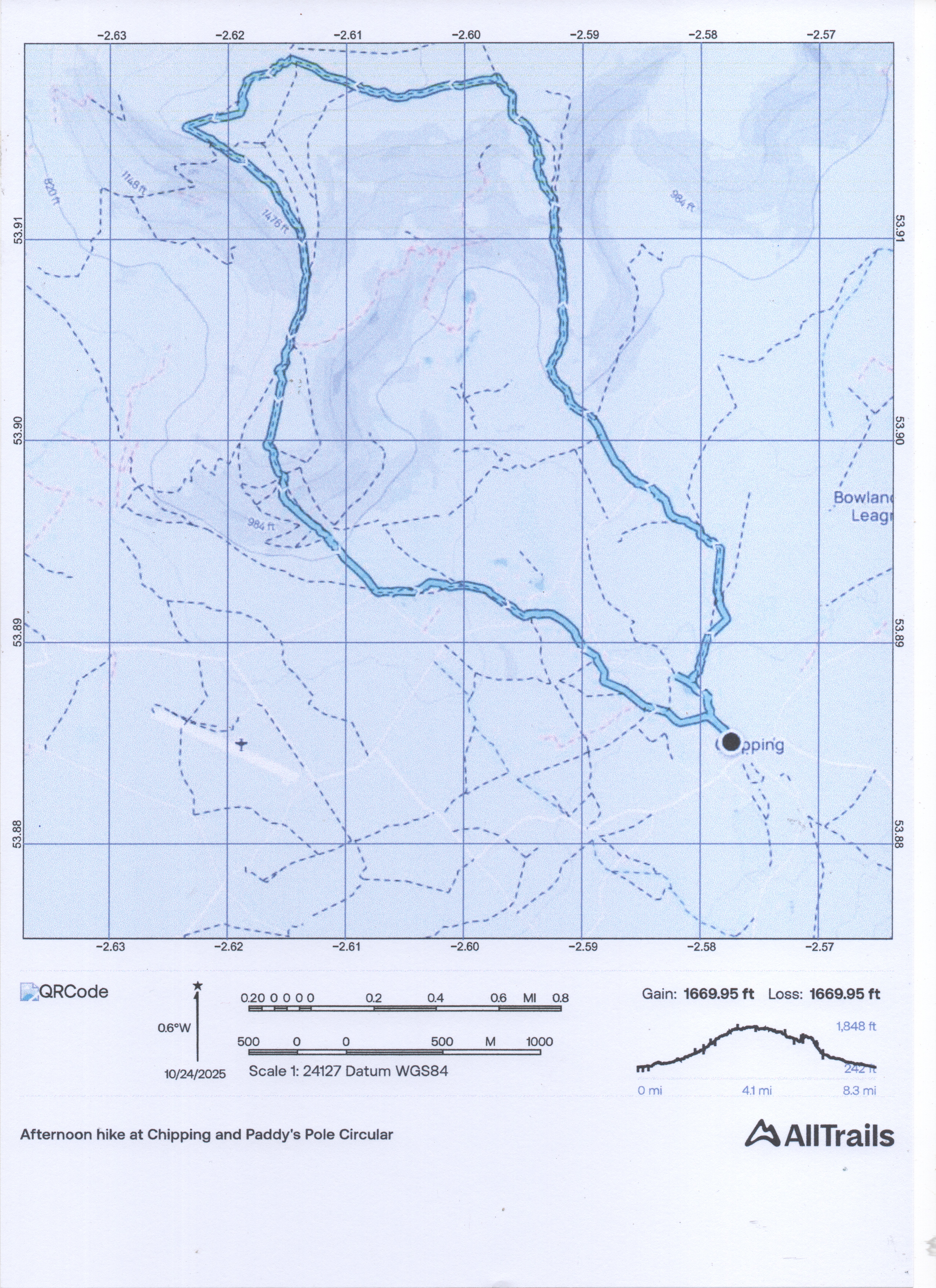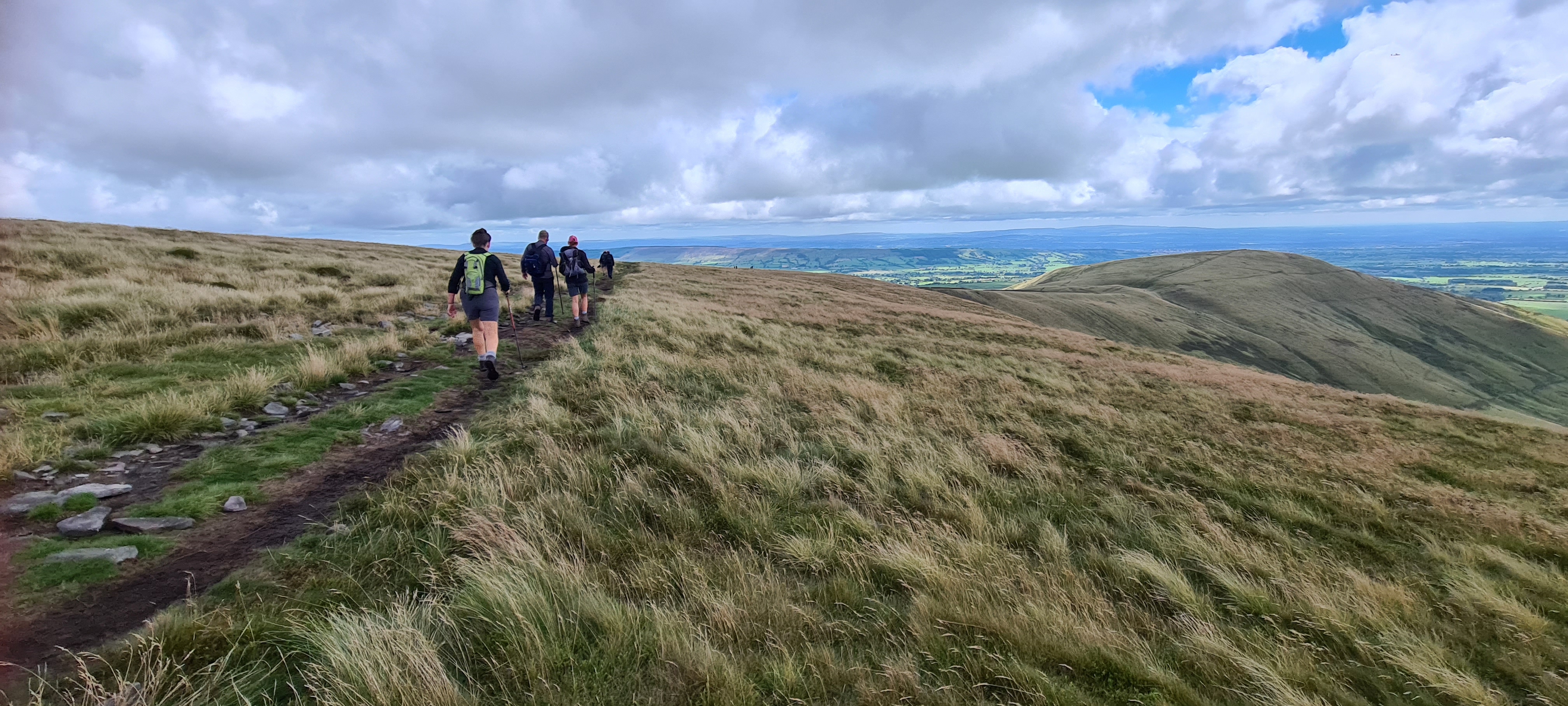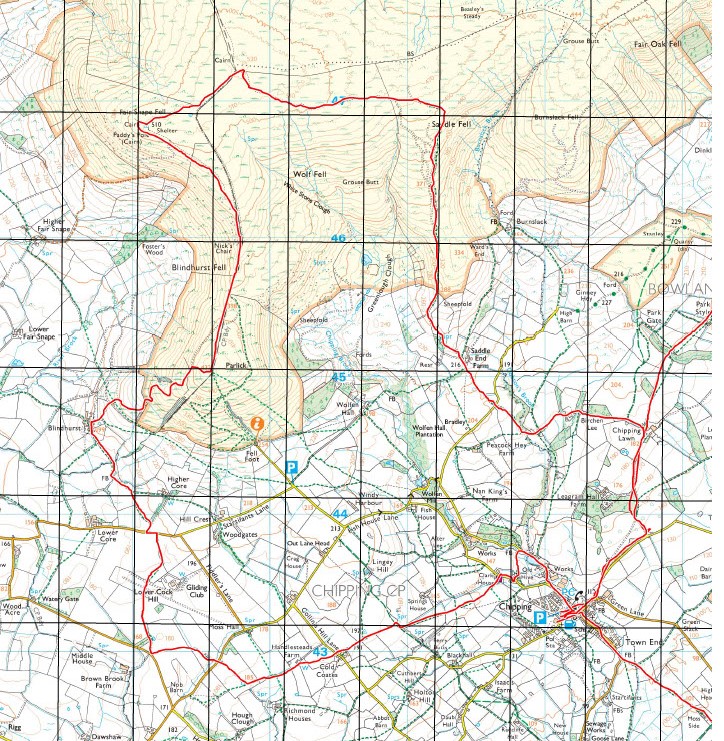 B Walk Lead by John & Andrea - 8 Miles - Total ascent 1512 feet The B walk is a typical fell walk, and although we dont cover a great distance, only 8 miles, we will be climbing. You will however, if the weather permits, be rewarded with some spectacular views over Lancashire & beyond. We start the circular walk in the village of Chipping and climb to Saddle Fell. We continue across open moorland to FairSnape Fell before swinging across to the top of Parlick. There is a steep descent down Parlick Fell to Fell Foot and then a straightforward walk back to Chipping. .